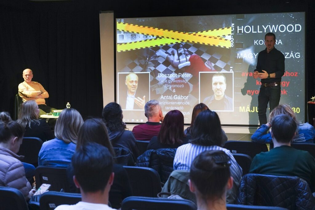 Hogy egy jótékonysági est lehet izgalmas, befejezhetetlen, azt a pénteki előadás bizonyítja. Két és fél órán át szegezte székhez a közönséget. Az előadás felépítése önmagában is érdekes volt. Doszpot és Antal azt kutatta, mennyiben hitelesek a hollywoodi sikerkrimik és horrorok a magyarországi „házi bűnügyek” nyomozási gyakorlatával összevetve. Több nálunk is ismert filmből vetítettek részleteket. (Elrabolva, Zodiákus, A hetedik.) Doszpoték feladata az volt, hogy elemezzék, a dolgok így történhetnek-e. Hiteles-e a fikció? Szakmai és morális kérdések kerülnek terítékre. A csábítás veszélye, az óvatlanság, mire képes törvény és ember végletekig kiszolgáltatott helyzetekben? Hogy zajlik a helyszínelés, a boncolás, a profilkészítés? Mit tehetnek az újságírók? Árthatnak, segíthetnek-e? Alkalmazhat-e erőszakot nyomozás közben a rendőr? Lehet-e maga is dühös, vegyíthető-e a nyomozás az élet más területein „korrupciónak” mondott elemekkel? Lehet-e „nyelvet venni”? Hol végződik az igazságszolgáltatás, s hol kezdődik a bosszú?
